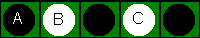 | Je mag niet een steen van je eigen kleur overslaan om een steen van je tegenstander om te draaien. De zet met steen A, draait dus alleen steen B om en niet steen C. |
